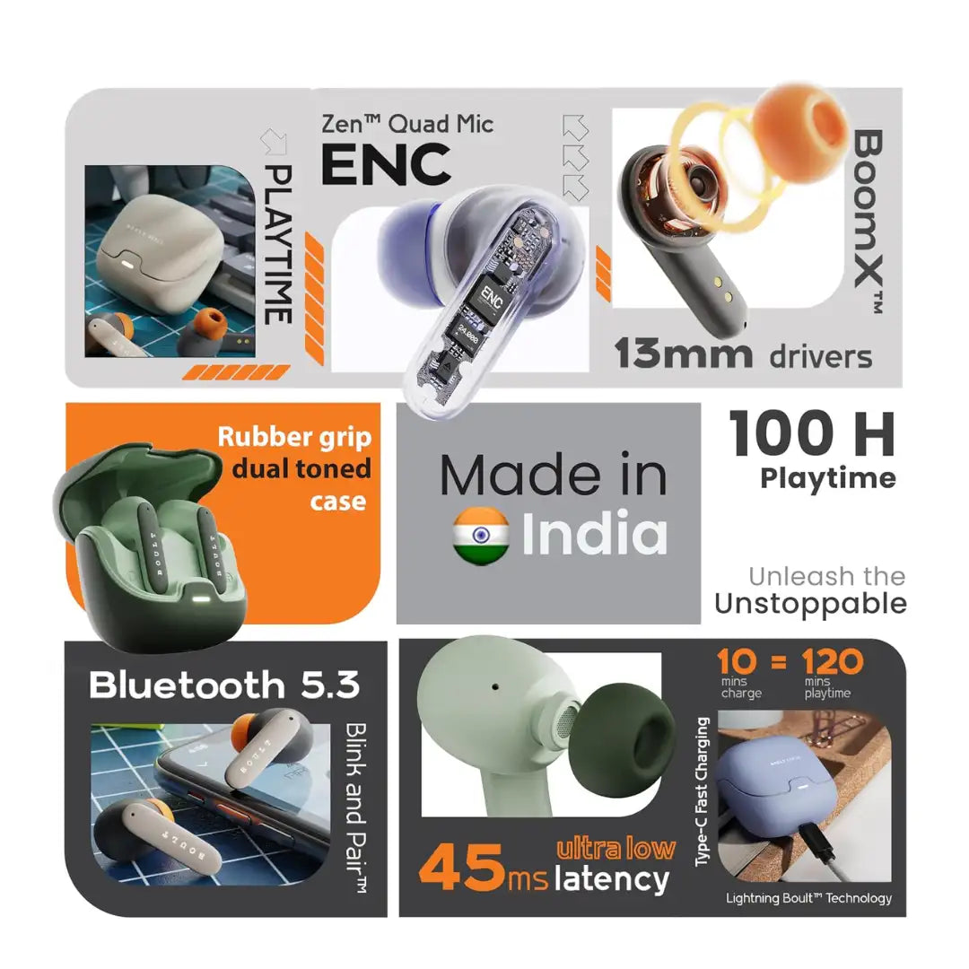 Boult Audio Xena Pro with 100H Playtime, Quad Mic ENC, 45ms Low Latency Gaming, Premium Rubber Grip Case, 13mm Bass Drivers, Made in India TWS Bluetooth 5.3 Truly Wireless in Ear Earbuds