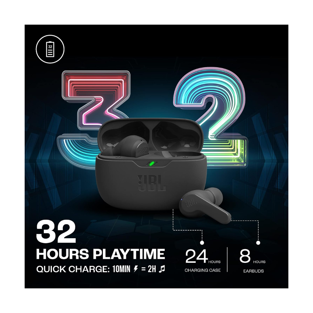 JBL Wave Beam Bluetooth Earbuds, Bluetooth v5.0, Battery Life 32 hours Playtime (based upon usage), Fast Charging 10min = 120min, Driver Size 8mm, Voice Assistant, Microphone, JBL Headphone App, JBL Deep Bass, Quick Charge, IPX5 Water Resistance, Weight 36g.
