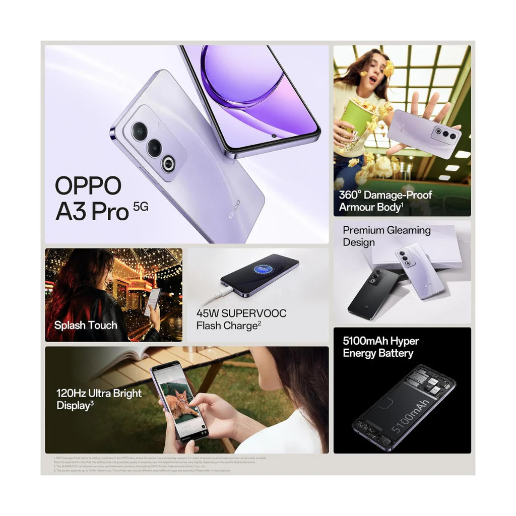 Buy Oppo A3 pro 5G is a powerful and attractive smartphone built for the modern consumer. The device boasts a 360 damage – proof Armor body a 45w SUPERVOCTM flash charge for rapid charging, and a 5100 mah Hyper energy Battery with a lifespan of over four years.