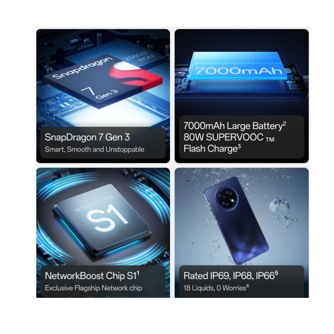 Buy The Oppo F31 Pro Plus is a durable 5G Smartphone featuring a snapdragon 7 Gen 3 Processor a large 7000 mah battery with 80w fast charging ,IP69 rated durability a 50MP main camera and a 6.8inch 120hz AMOLED display.It Offers high speed performance for gaming and daily use, along with advanced cooling and AI features.