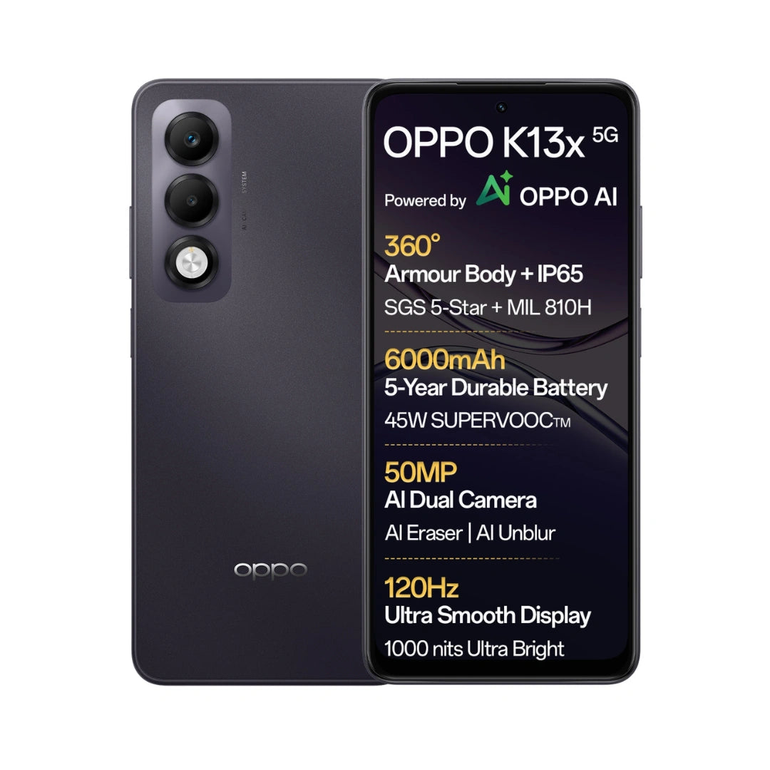 OPPO K13x 5G is a Budget-Friendly Smartphone Featuring a large 6000mAh Battery with 45W Charging, a 120Hz LCD Display, and MediaTek Dimensity 6300 Chip for reliable 5G Performance, alongside a 50MP AI Main Camera and AI-Powered Features in ColorOS 15, Focusing on Ruggedness (IP65, Armour Body) and long-lasting use.