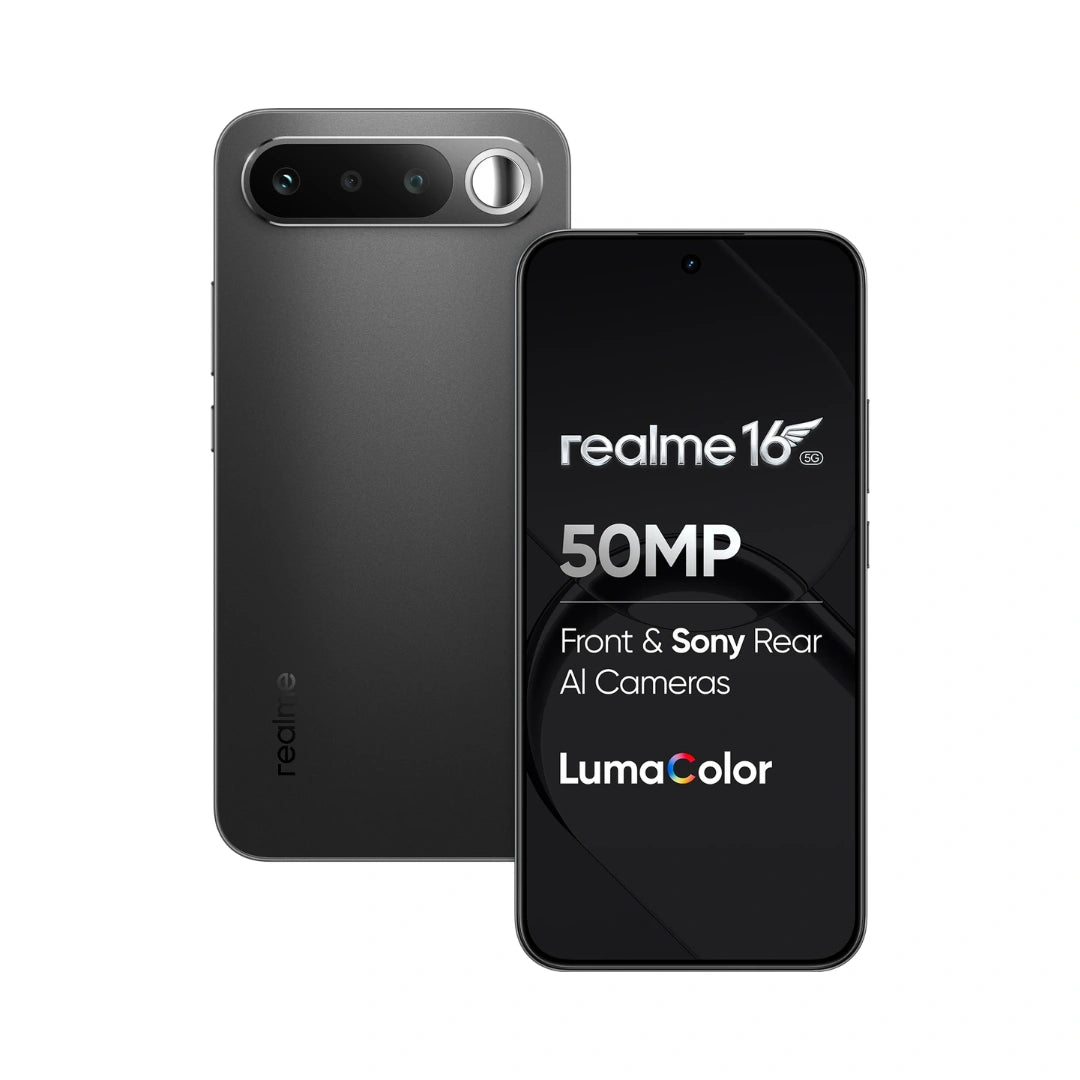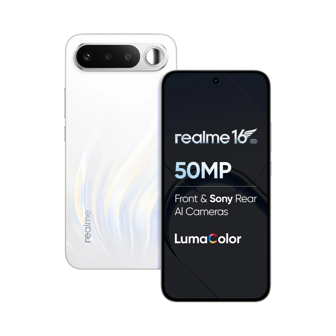 The Realme 16 5G, a mid-range smartphone with emphasis on battery life and design is a "Portrait Star" smartphone with a high-capacity 7000mAh battery in a slim 8.1mm unibody design, and it brings a camera bar design with a selfie mirror. Display has a 6.57-inch AMOLED display with a 120Hz refresh rate and a high peak brightness of 4,200 nits for better viewability in sunlight Conditions has a dual-camera setup with a 50MP Sony IMX852 primary camera and a 2MP monochrome lens. Front has a high-resolution 50MP Camera for content Creators. Durability & Cooling has an IP69 rating for water and dust protection. Software comes with realme UI 7.0 based on Android 16, with 3 years of OS updates and 4 years of security updates.