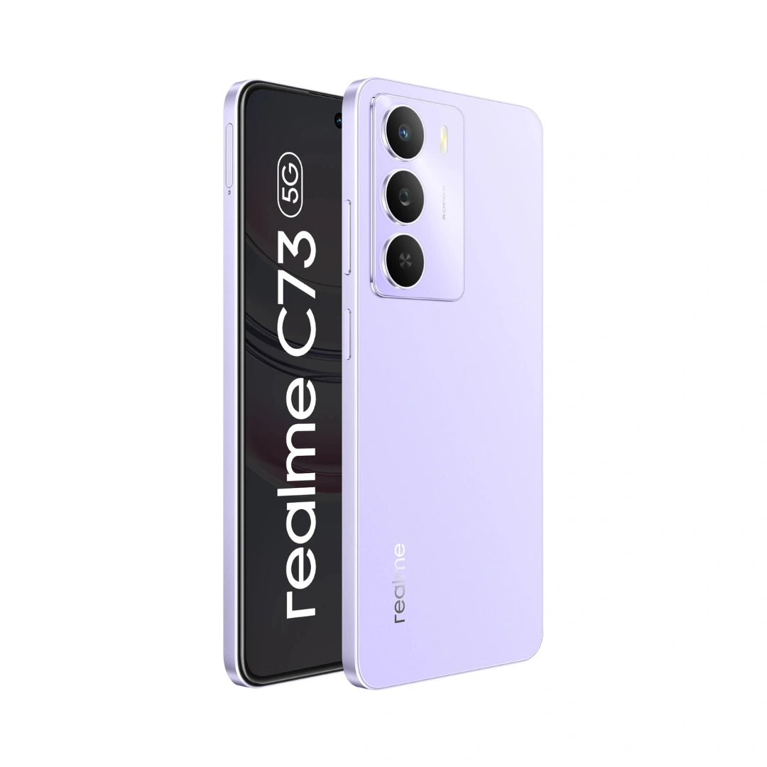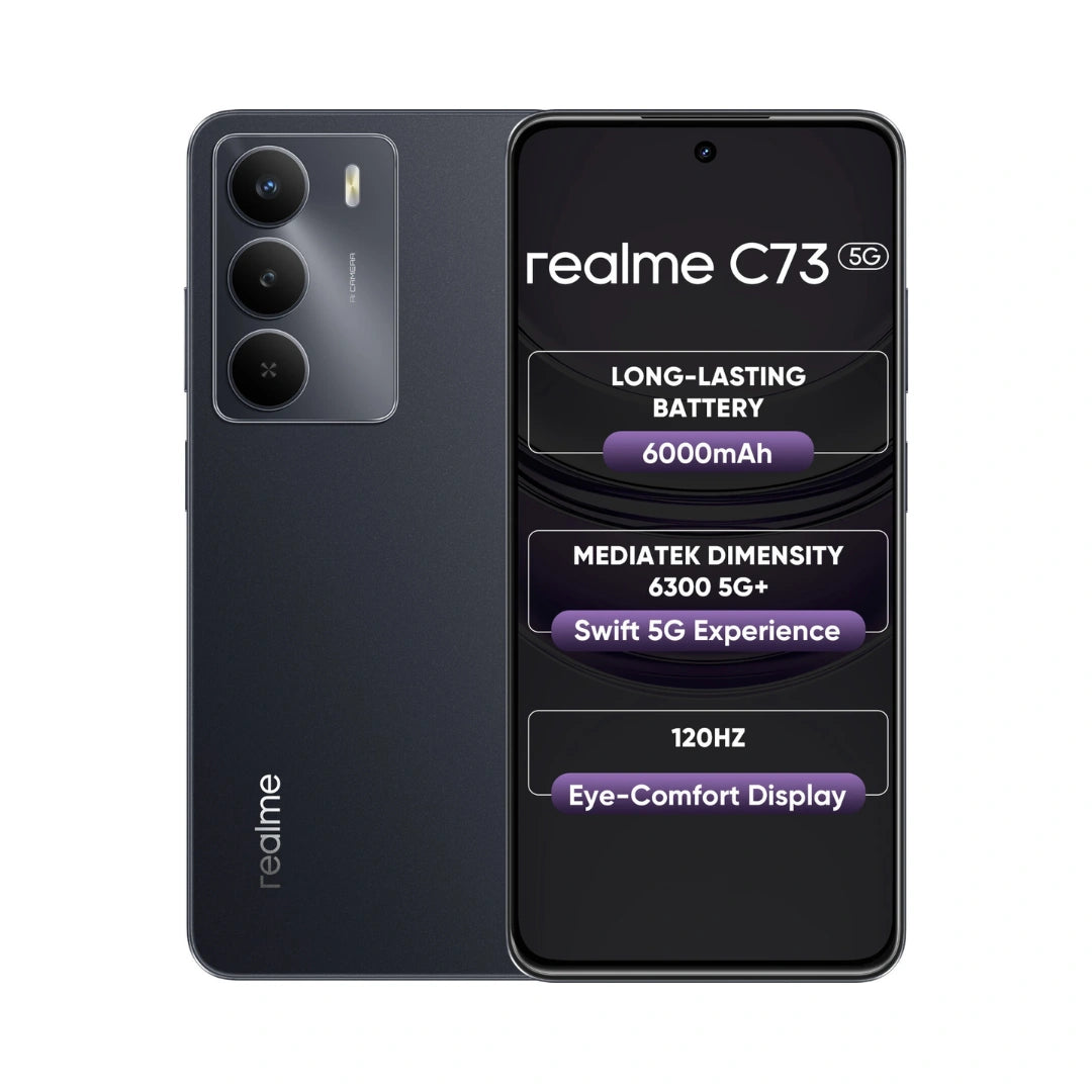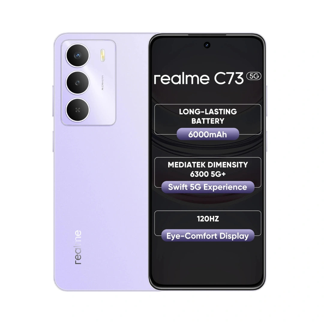 REALME C73 5G is a Budget-friendly smartphone featuring a large 6.67-inch 120Hz HD+ Display, a Powerful MediaTek Dimensity 6300 5G Processor, a massive 6000mAh Battery with 15W charging, and a capable 32MP Main Camera, all Wrapped in an IP64-rated, slim design with military grade durability and upto 12GB dynamic RAM for Smooth Performance.