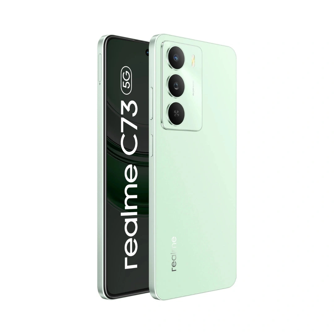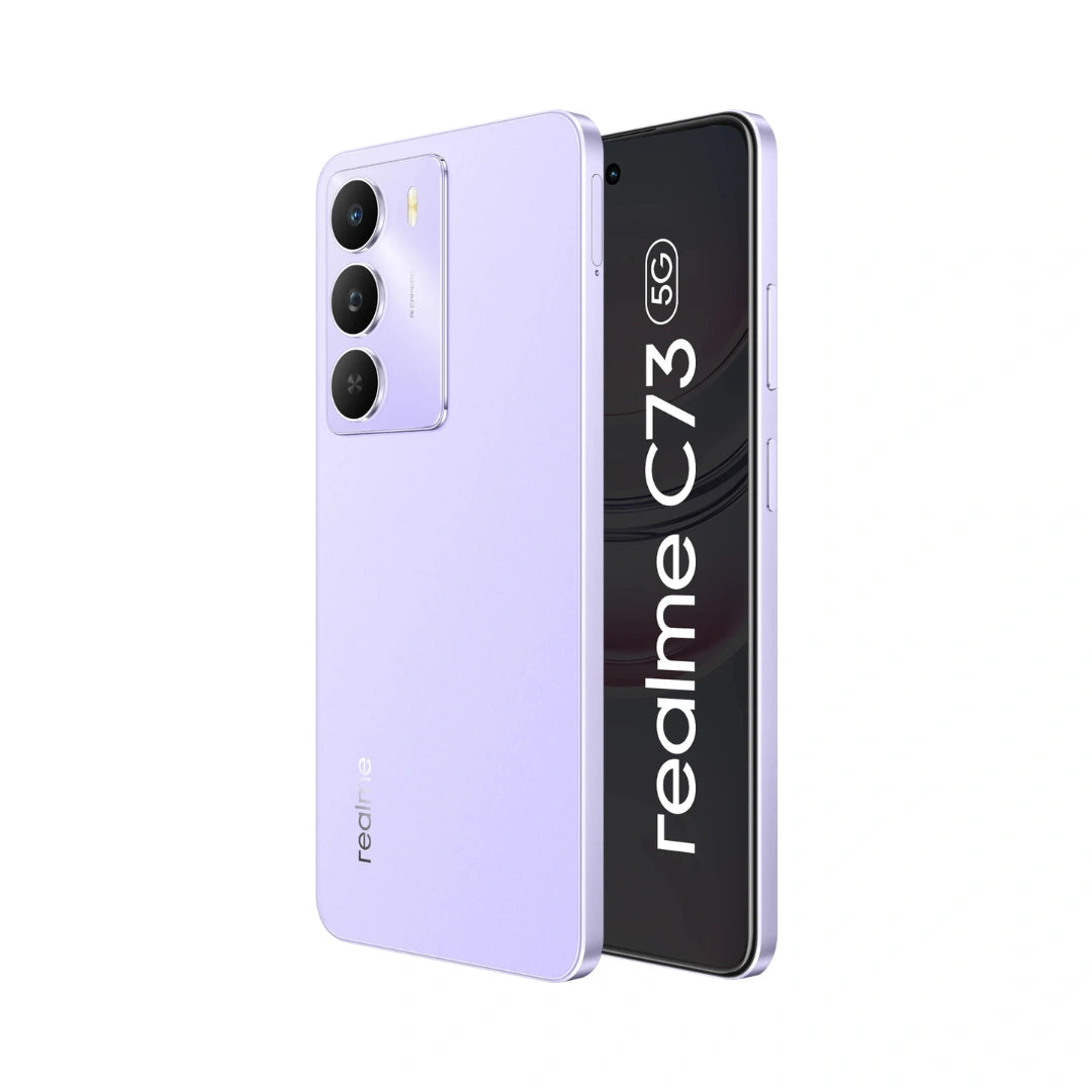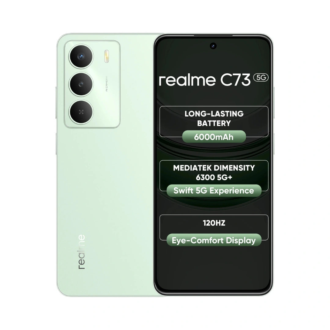 REALME C73 5G is a Budget-friendly smartphone featuring a large 6.67-inch 120Hz HD+ Display, a Powerful MediaTek Dimensity 6300 5G Processor, a massive 6000mAh Battery with 15W charging, and a capable 32MP Main Camera, all Wrapped in an IP64-rated, slim design with military grade durability and upto 12GB dynamic RAM for Smooth Performance.