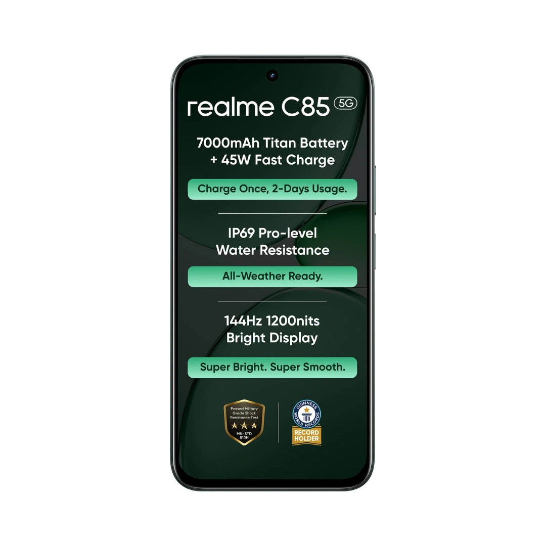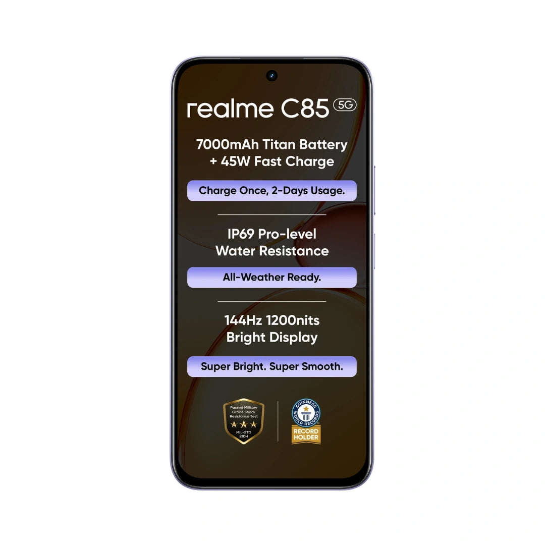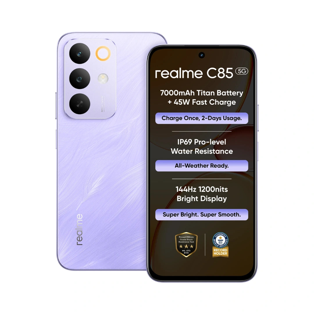 Realme C85 5G | 6.8 inches Display | Mediatek Dimensity 6300 | 50MP Rear Camera | 8MP Front Camera | 7000 mAh Battery