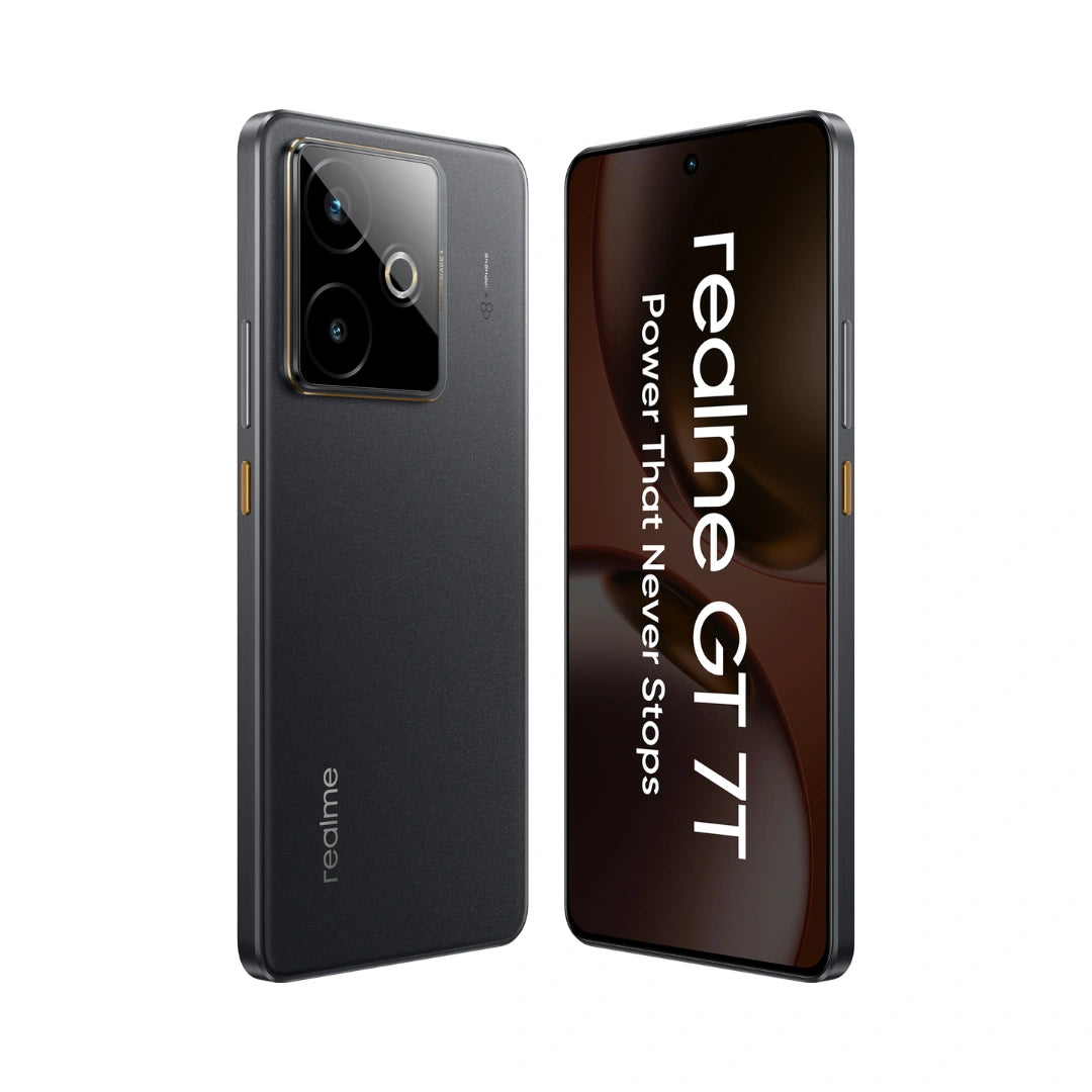 Buy The Realme GT 7T Features a large 6.8-inch 120HZ AMOLED display, a Media Tek Dimensity 8400Max Processor, and a 7000 Mah Battery with 120w fast charging .It also Boasta a 50MP dual rear camera system and a 32MP Front camera, with options for 4k video recording at 60fps according to realme.
